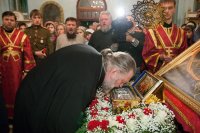 В Константино-Еленинском кафедральном соборе состоялась торжественная встреча святыни и молебен, который совершили митрополит Астанайский и Казахстанский Александр, архиепископ Уральский и Актюбинский Антоний, епископ Костанайский и Рудненский Анатолий, епископ Усть-Каменогорский и Семипалатинский Амфилохий, в сослужении клириков епархии.