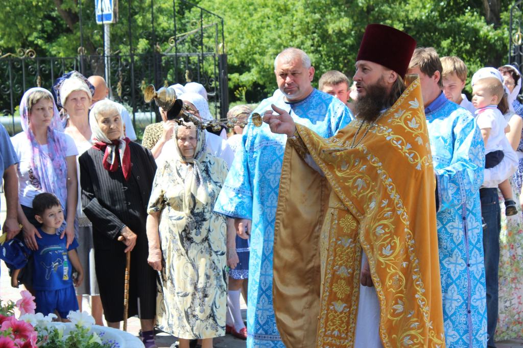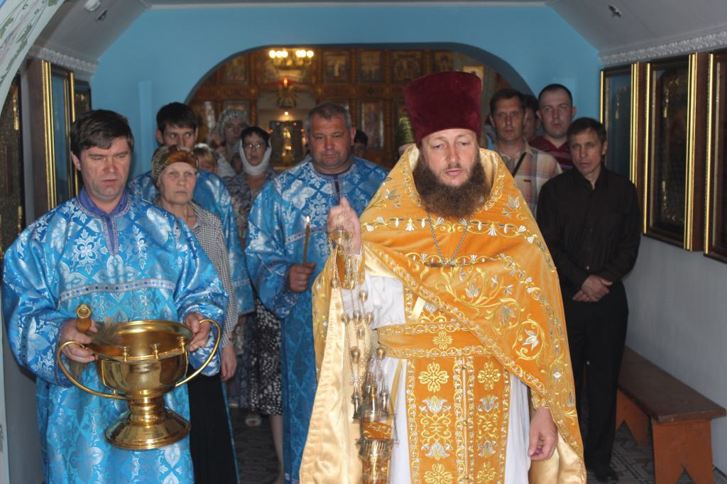 Отец Евгений окропил место под строительство святой водой и обратился к прихожанам с проповедью.