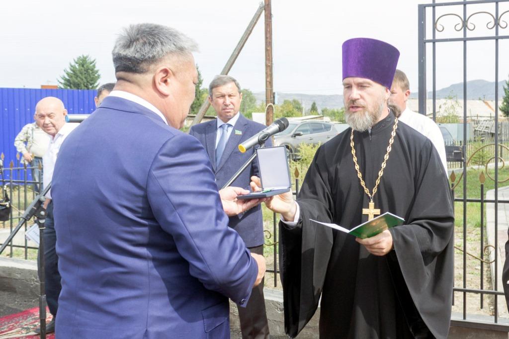 Торжественная часть ознаменовалась вручением церковных наград инициаторам, организаторам, благотворителям и руководителям строительства православной часовни: местным предпринимателям Виктору Сергеевичу Коровину и Галине Михайловне Тузиковой; директору ТОО «Управление механизации и строительства» г. Усть-Каменогорска Александру Николаевичу Сидорову; депутату Восточно-Казахстанского областного маслихата Лукбеку Шабдановичу Тумашинову.
