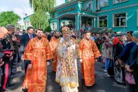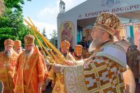 После чтения часов, перед началом Литургии, при пении пасхальных тропарей великая святыня – ковчег с частью Животворящего Креста Христова и частицами мощей 12-ти святых апостолов – была встречена у ворот храма, перенесен крестным ходом к месту совершения богослужения и установлен на престоле.